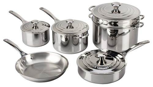 10 Piece Set Essential Stainless Steel ( 9.5 in. Frying Pan, 11 in. Frying Pan, 2 qt. Saucepan with Lid, 3 qt. Saucepan with Lid, 4 qt. Saucepan with Lid, 4 qt. Stockpot with Lid) | Le Creuset